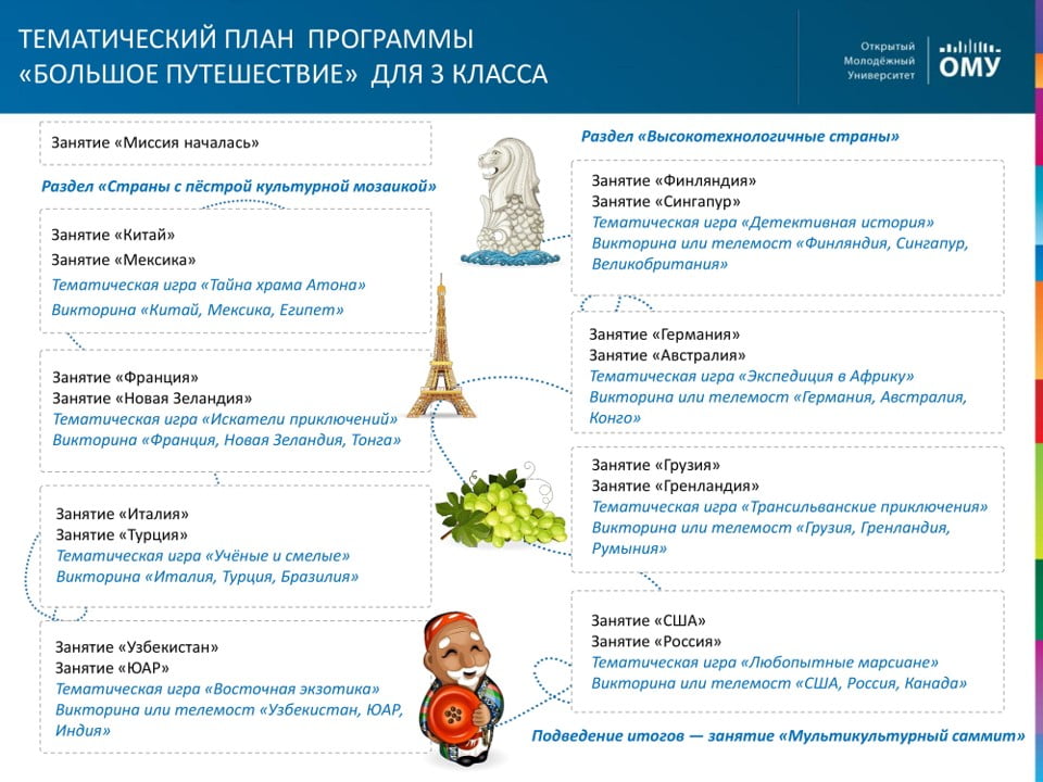 В третьем классе ребятам предстоит отправиться в Большое путешествие. Дети посетят 24 страны и погрузятся в культурные, социальные, технологические особенности разных уголков планеты.