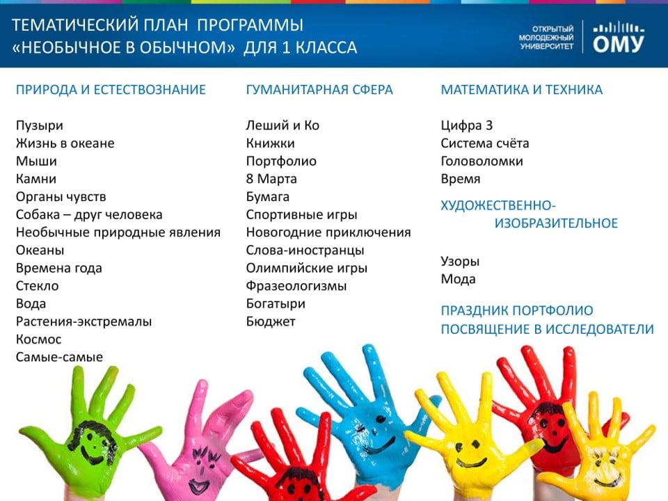 В первом классе ребята узнают необычное в обычных и привычных предметах и явлениях — мыльных пузырях, радуге, цифрах. Они учатся задавать вопросы, искать на них ответы, проводя опыты и эксперименты, создавая простейшие механизмы и закладывая основы исследовательского и изобретательского мышления.